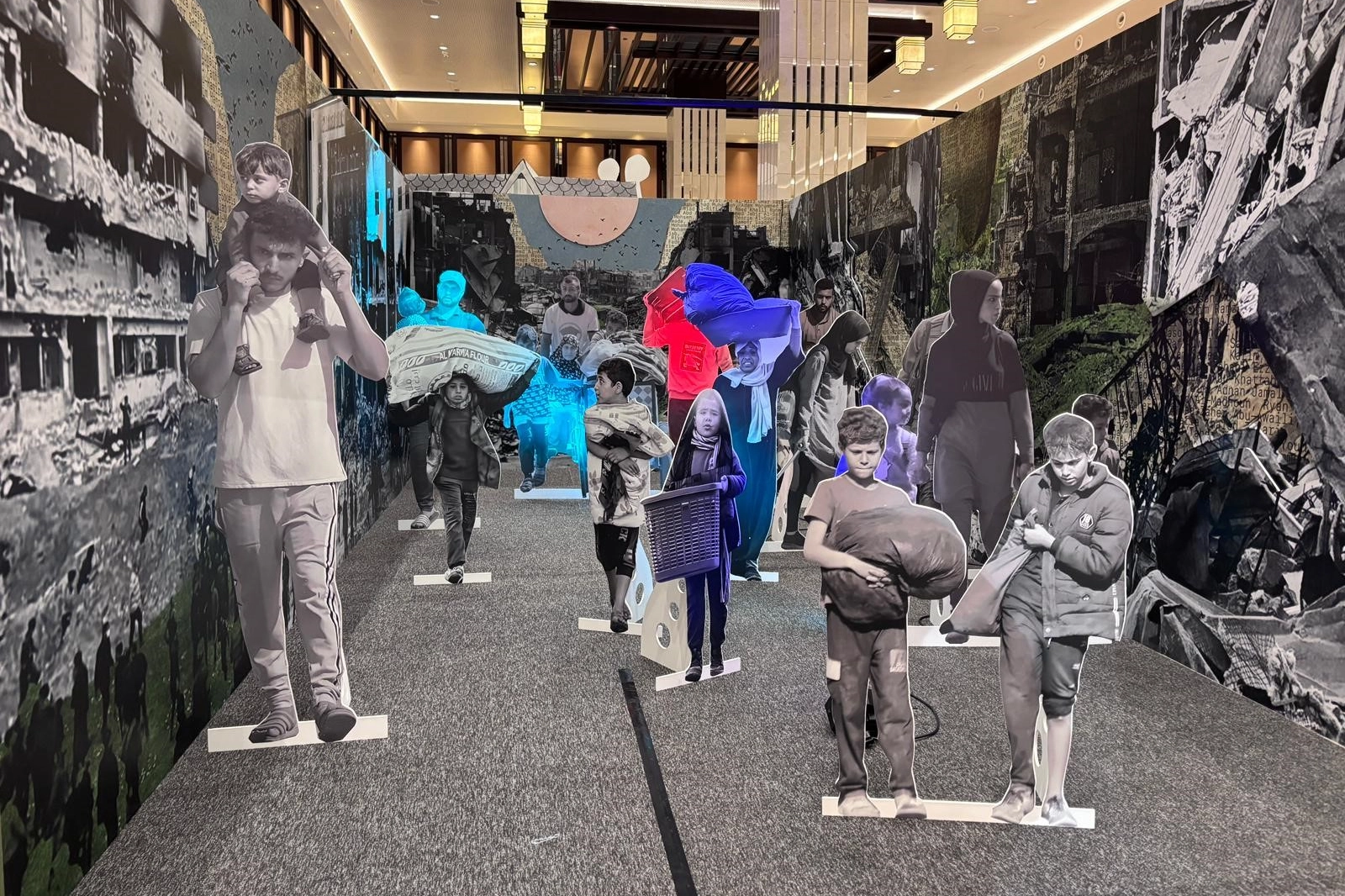 Ayrıca sergide, Gazze’deki insanlık dramı ve göç meselesini ele alan bir bölüm de mevcuttur. Ziyaretçiler, resimlerin önündeki tabletleri kullanarak canlandırılan aile hikayelerini izleyebiliyor.