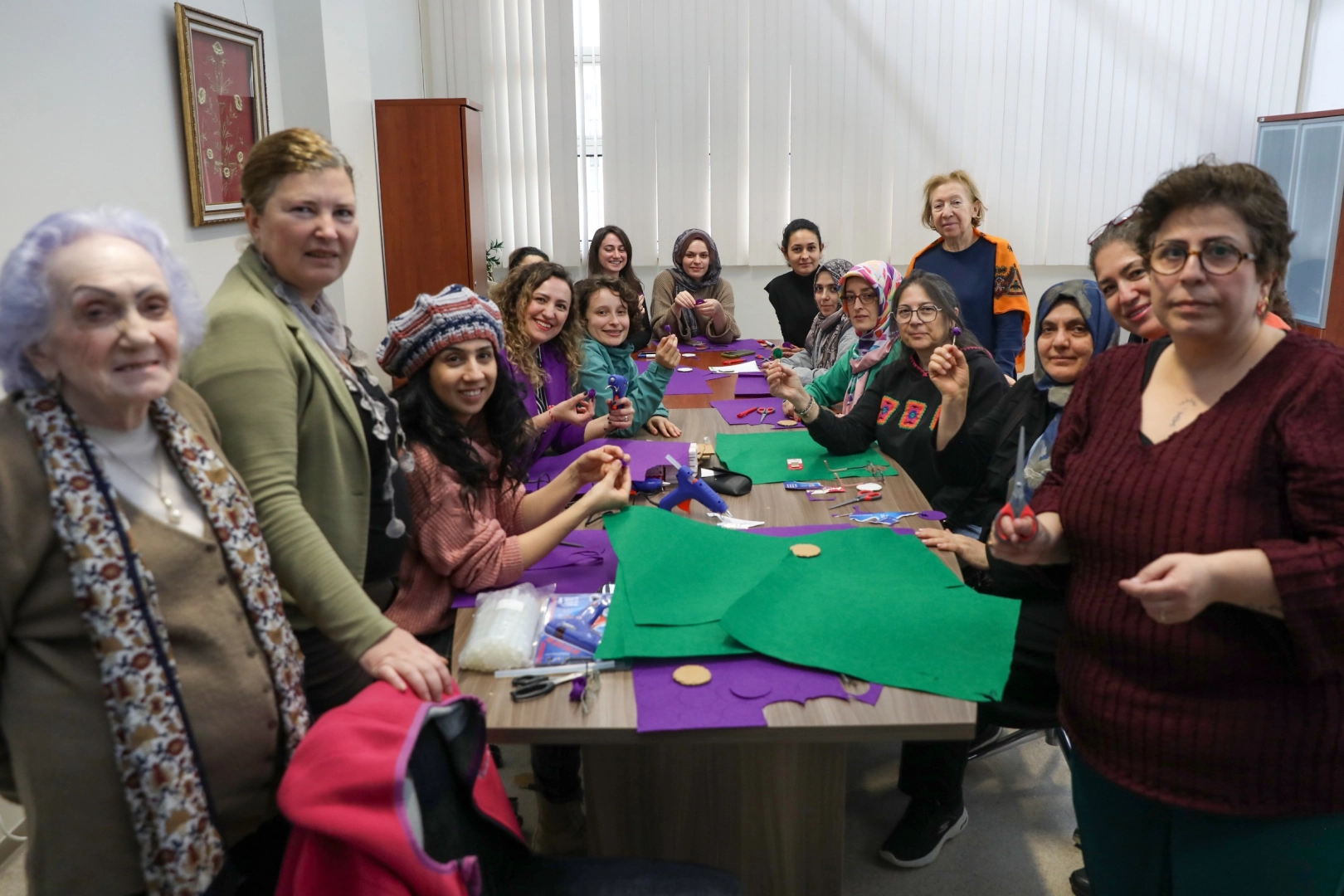 Bursa Kent Konseyi Kadın Meclisi’nde gerçekleştirilen atölye çalışmasında, keçe kumaşlar, renkli iplikler, düğmeler ve süsleme malzemeleri kullanılarak birbirinden renkli ürünler hazırlandı. Kadınların dayanışma ve ortak üretim gücünü bir kez daha ortaya koyan ürünler, 8 Mart Pazar günü yapılacak yürüyüşte kullanılacak.