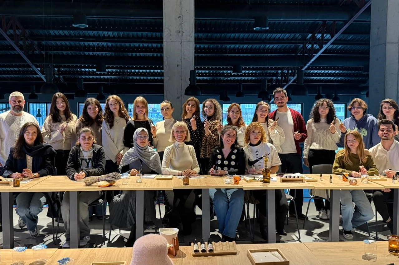 DUYGU, BELLEK VE KOKU ARASINDAKİ İLİŞKİ Atölye yürütücüsü Ebru Şahin, tat ve koku duyularının genellikle birbiriyle uyum içinde çalıştığını belirtti. Tat duyusunun tatlı, tuzlu, acı, ekşi ve umami olmak üzere beş temel kulvardan oluştuğunu ifade eden Şahin, koku duyusunun duygu durumları üzerindeki etkisine dikkat çekti. Kokuların beyindeki işleyişine dair bilgiler veren Şahin, şunları söyledi: "Limbik sistem, koku uyaranlarının doğrudan işlendiği bölgedir. Bu bölge aynı zamanda uzun süreli bellek, aşk, sevgi, nefret, öfke ve korku gibi duyguları yönlendirir. Dolayısıyla duygu, bellek ve koku arasında çok yakın bir komşuluk ilişkisinden bahsedilebilir." Kendi parfümlerini tasarladılar Teorik bilgilendirmelerin ardından atölyenin uygulama kısmına geçildi. Katılımcılar, farklı özlere sahip kokuları tek tek deneyimleyerek içerikleri hakkında bilgi altı. Etkinliğin sonunda katılımcılar, Ebru Şahin eşliğinde öğrendikleri teknikleri kullanarak kendi doğal parfümlerini tasarlama fırsatı buldu.