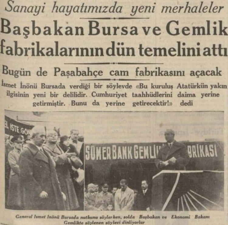 Aynı gün içinde Türkiye’nin ilk Sunğipek üretimi yapacak olan fabrikasının temelini atmak üzere Gemlik’e ulaşan Başbakan İsmet İnönü ve İktisat Vekili Celal Bayar ve beraberindekiler, eski tersanenin bulunduğu alanda karşılanıyordu. Öncesinde ise neredeyse bütün Gemlik halkı temelin atılacağı bu bölgeye akın ediyordu.