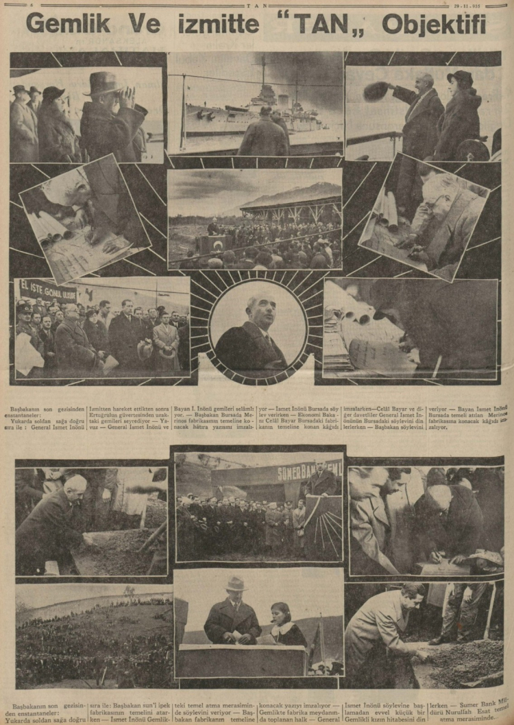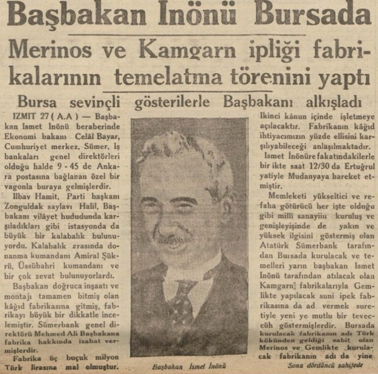 27 Kasım 1935 günü; Başbakan İsmet İnönü ve İktisat Vekili Celâl Bayar, beraberlerindeki Sümerbank, İş Bankası ve Merkez Bankası yöneticileriyle Ankara’dan İzmit’e hareketle burada yeni yapılan, İzmit Kâğıt Fabrikası’nı geziyordu. Heyet, ardından Merinos fabrikasının temelini atmak üzere Ertuğrul Yatı ile Mudanya’ya geçiyordu. İnönü ve Bayar, Mudanya iskelesinde Bursa Valisi Şefik Soyer, Garnizon Komutanı General Salim Cevad, Parti İl Başkanı Milletvekili Doktor Sadi Konuk ve halk tarafından büyük bir coşkuyla karşılanıyordu.