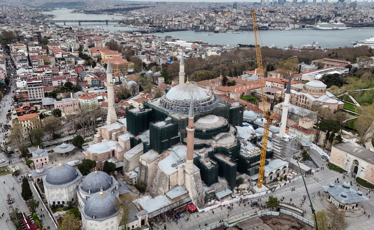 Havadan çekilen güncel görüntülerde, kubbe çevresine kurulan geniş çelik platformlar, vinç düzenekleri ve yoğun iskele ağı göze çarpıyor. Yapının üst bölümünü çevreleyen bu sistemler, geçici çatı uygulamasının sahada aktif şekilde devam ettiğini ortaya koyarken, kubbenin tamamen kapatılmasına yönelik hazırlıkların son aşamaya geldiğini kanıtlıyor. Uzmanlar, bu yöntemin hem restorasyonun güvenli bir şekilde tamamlanmasını sağladığını hem de Ayasofya'nın iç mekanındaki tarihi dokunun korunmasına önemli katkı sunduğunu belirtiyor.