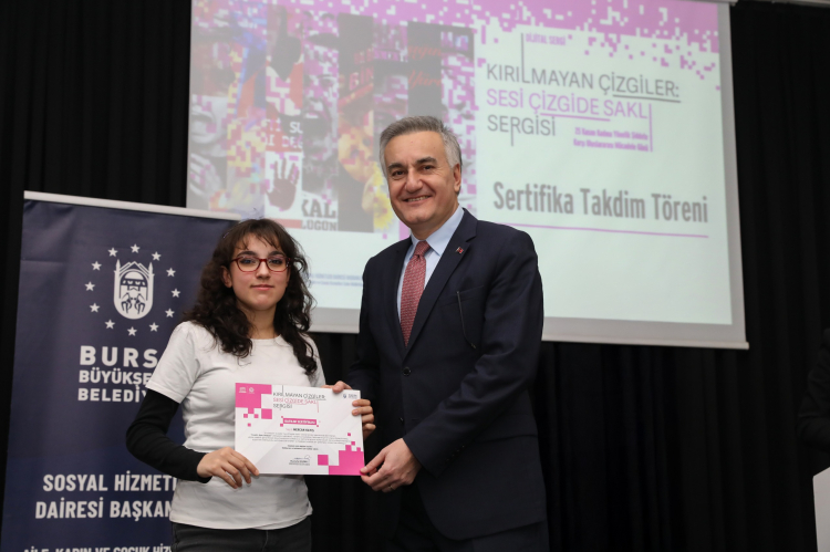 Bursa Büyükşehir Belediyesi'nin katkılarıyla gerçekleşen 'Sesi Çizgide Saklı: Kırılmayan Çizgiler' dijital poster sergisine katılan öğrencilere sertifikaları verildi.