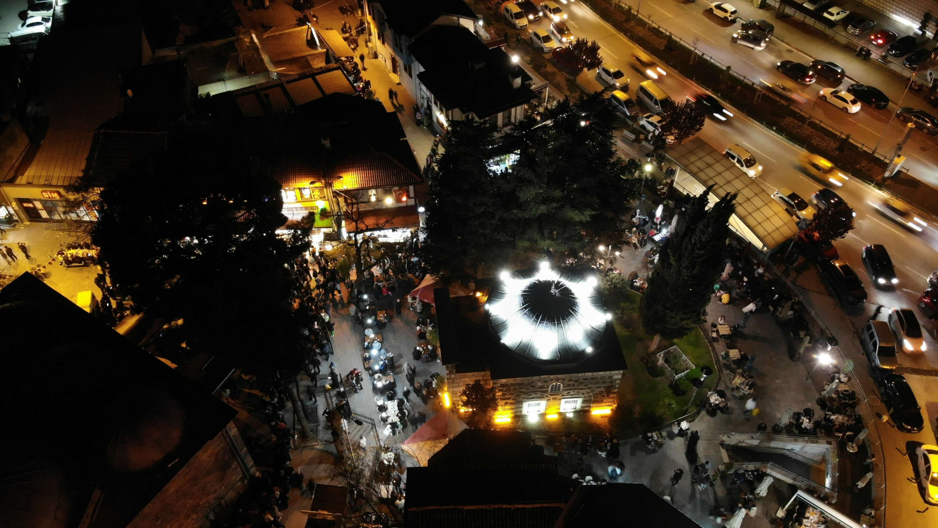 Bursa’da Tarihi Abdal Meydanı'nda simit ve tahinli pide ile sahur yapmak isteyen vatandaşlar metrelerce kuyruk oluşturdu. Havanın da iyi olması sebebiyle adım atılacak yer kalmayan meydan havadan da görüntülendi.