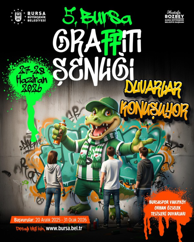 Bursa Büyükşehir Belediyesi'nin düzenlediği Türkiye'nin en büyük graffiti organizasyonu olan Graffiti Şenliği, 27-28 Haziran 2026'da Bursaspor Vakıfköy Tesisleri'nde yapılacak. Etkinlikte yerli ve yabancı sanatçılar duvarları tuval olarak kullanacak.